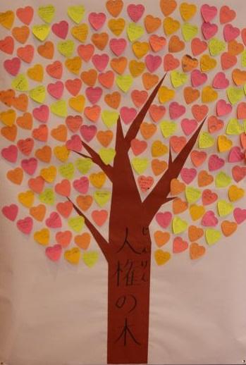 法務省の人権擁護機関では、今年の12月4日~10日までを「人権週間」と定め、人権についての啓発活動を行っていました。本校では、この期間に合わせて「人権の木」という取り組みを行いました。「周りの人の良いところ」や「してもらって嬉しかったこと」などをハート型の付箋紙に記入して台紙に貼り付け、大きな「人権の木」が完成しました。周囲の方々と優しく接することができる皆さんであることが幸せです!