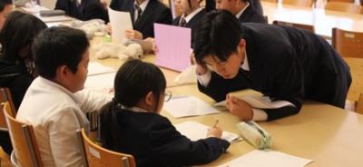 5限目に第2回海青学習会を行いました。第1回は、1学期に6年生と9年生が算数・数学で行っています。今回は、4年生と7年生が国語で行いました。4年生と7年生が一緒に学び合いながら、主語と述語のつながりについて確認しました。課題に取り組む中で、4年生が疑問に思ったことを7年生に投げかけたり、お互いに考え方を説明し合ったりする姿が見られました。特に7年生が「どう説明したら伝わるか」を考え、相手の理解度に合わせた言葉を選び出しながらアドバイスをする姿が多く見られました。異学年が一緒に学ぶことで、自分の考えを整理して伝えるよさや、相手の説明を聞いて理解を深めるよさを感じていました。学んだことを今後の文章づくりなどに生かしていけるといいなと思います。