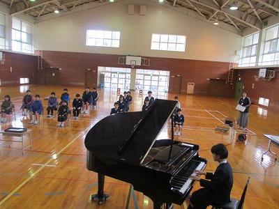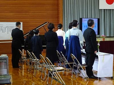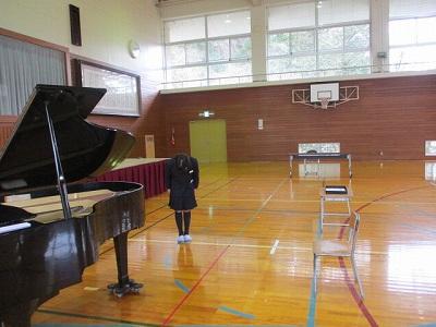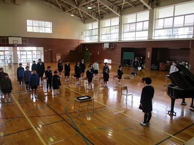 国歌斉唱。伴奏は先生。校歌斉唱。伴奏は5年生。
