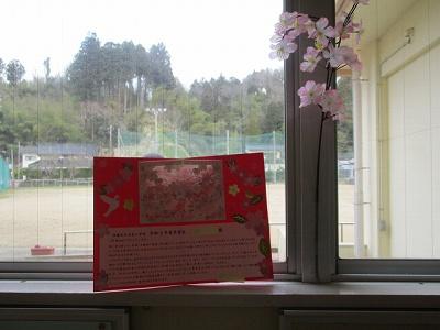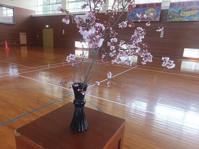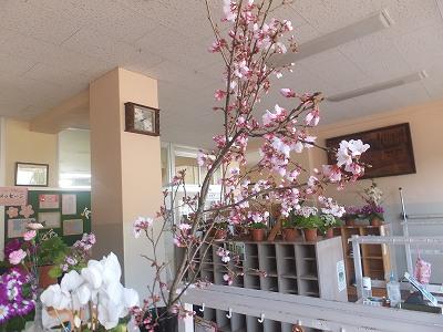 3/24 修了式の朝です。校務員さんが、ご自宅より桜の枝を持ってきてくださいました。