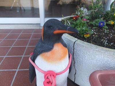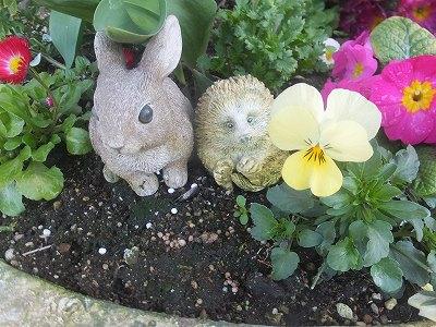 玄関の花壇、マスコットのうさぎさん、はりねずみさん、ペンギンさんも