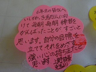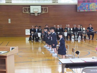 在校生の出し物は、6年生一人一人の人となりや思い出が語られるあたたかいものでした。6年生のお礼の出し物には、学校を託す在校生への熱い思いが表れていました。少人数の刈安小学校のよさが十分表れる会だったと思います。