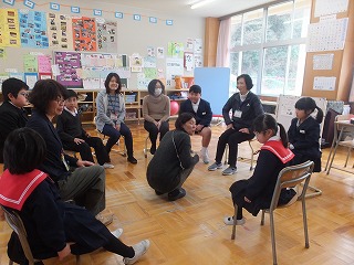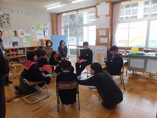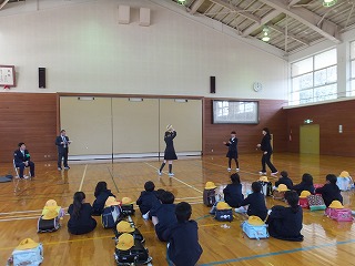 6年生と教師で、不審者に遭遇した場面の役割演技をし、どう対応したらよいのか、みんなで考えました。