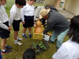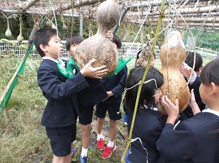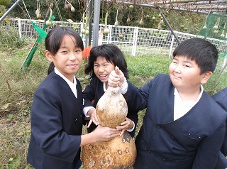 地域の小谷さんのご支援で栽培・収穫したひょうたんに、4年生が絵付けを行いました。