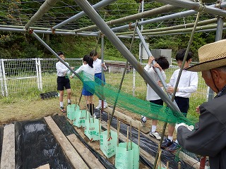 風があったので、子どもたちはこのマルチシートを被せるのに