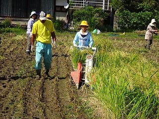 はじめに刈安営農組合の方から苗の植え方を教えていただき、きれいに整備された田んぼに入り、「かぐらもち」の苗を植えました。