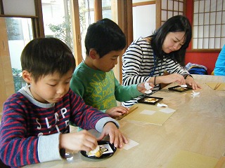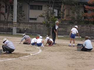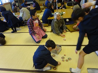 子どもたちは、25人ほどのおばあちゃんたちと「お手玉」「こま」「けん玉」「おはじき」「めんこ」を一緒にして、ずいぶん上達した子もいました。