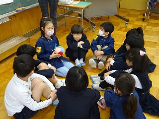 2月の大雪のため延期になっていた昔遊びの会を、1年生と「百彩会倶利伽羅チーム」の皆様が刈安公民館で行いました。