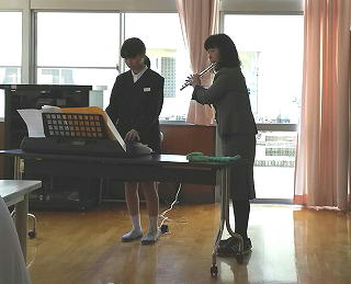 給食の時間の最後に、校長先生と6年生の石山さんが、フルートとピアノでコラボしました。