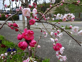 旧国道に面した花壇に、1本の木に赤白の花が咲く桃が満開です。