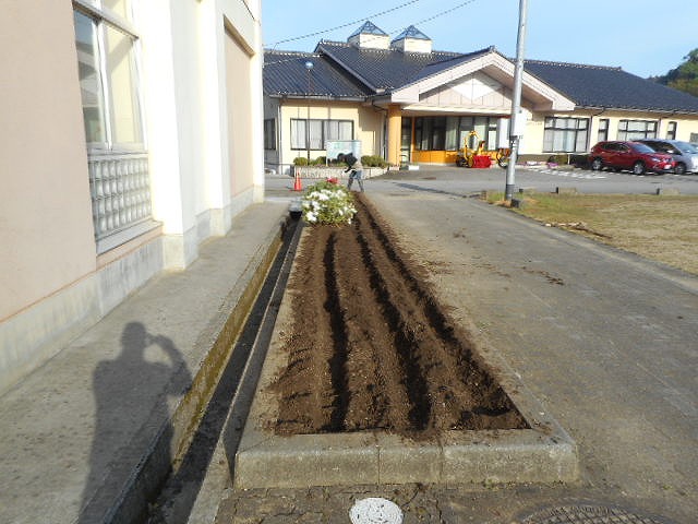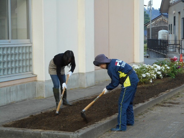 花の苗植えに備えて、PTA環境部の皆様が花壇の整備をしてくれました。おかげさまで大変きれいになりました。早朝より整備していただき誠にありがとうございました。