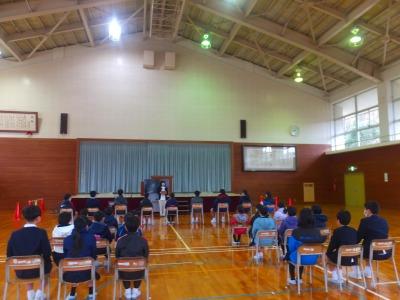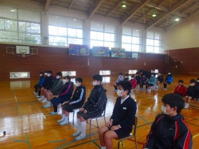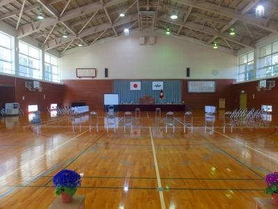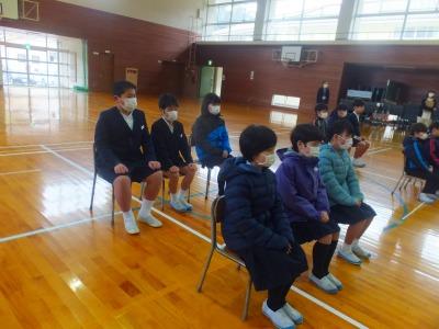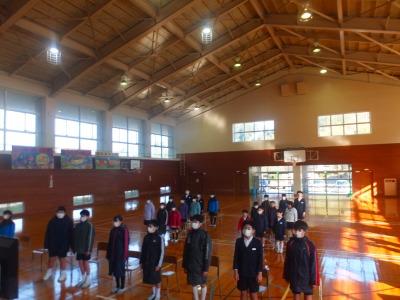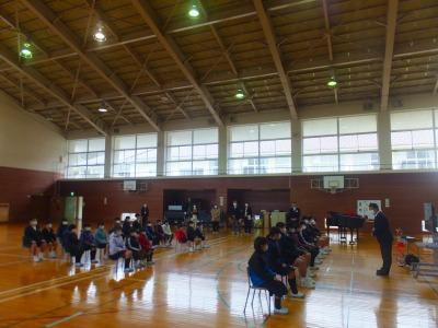 3月の全校集会。椅子をもって体育館に入り、卒業式の位置で行いました。