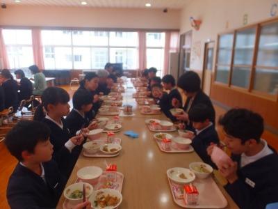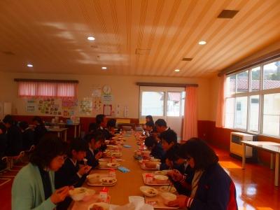 ランチルームで、6年生とともに食べる最後の給食。一日早くひなあられがでました。