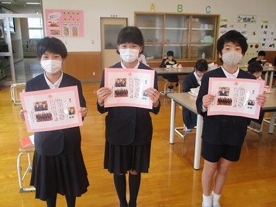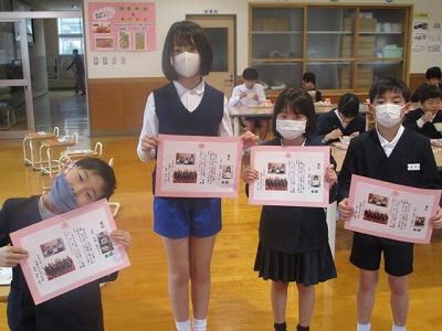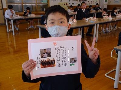 表彰式。家庭学習どんどんカードのパーフェクト賞が5名、おめでとう!!