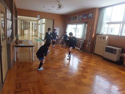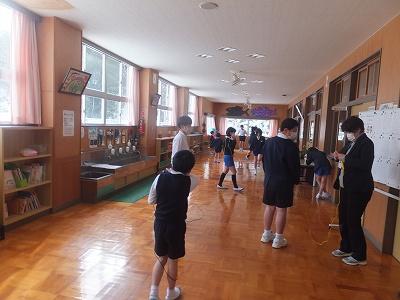 縄跳びタイム、火曜日は短なわ。源氏チームは1階、平家チームは2階で