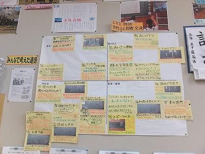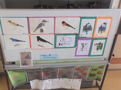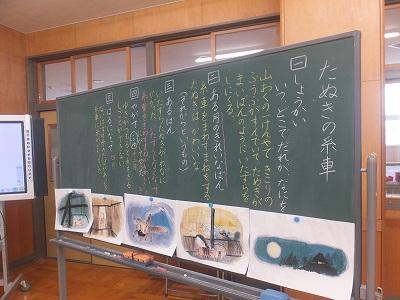 掲示板には「たぬきの糸車」の学習のあしあと。かわいいたぬき。