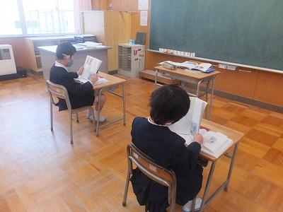 給食準備中。 配膳を待つ間、すらすら音読。