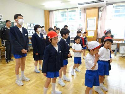 【防犯パトロール隊紹介式】登下校の見守りをしてくださっている方々の紹介式を行いました。登下校時、歩道を1列で歩いたり、交通ルールを守ったりしているというお褒めの言葉をいただきました。