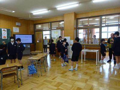 【給食】給食後に、食事のマナーについて、養護教諭が話をしました。食べる時の姿勢やお茶碗の持ち方、お箸の使い方などについて話しました。