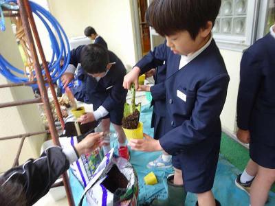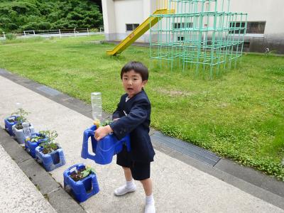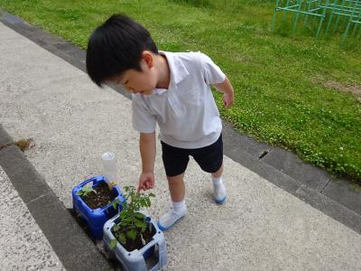 【1・2年生活科】朝顔やミニトマトのお世話をしました。日に日に生長していて、楽しみですね。