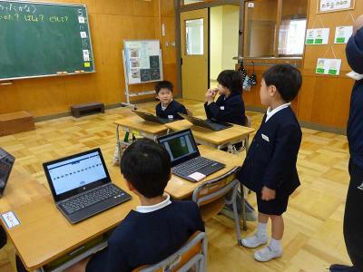 【1・2年生活科】学校で見つけたけれど、何かわからない物について、先輩たちに尋ねています。写真を見せて質問したところ、とても丁寧に教えてくれました。