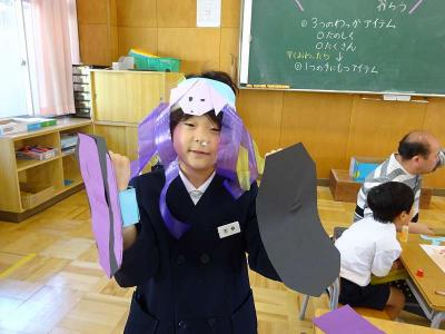 【1・2年生図工】1年:紙を破いた形から想像した絵を描きました。  2年:輪っかを作り、変身しました。