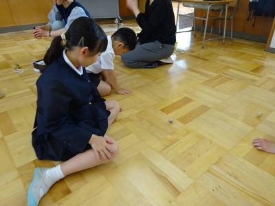 【休み時間】3年生は、国語で学習しているこまで遊んでいます。いろいろな種類のこまを試しています。