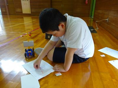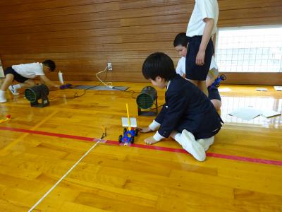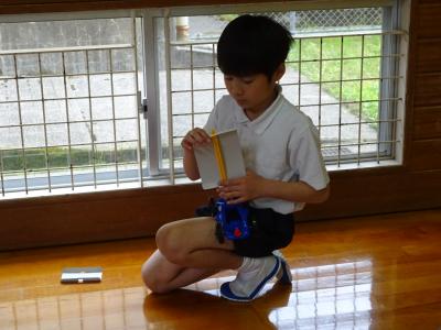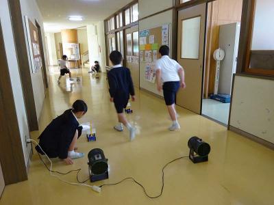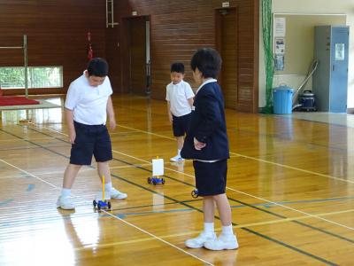 【3年理科】風の力で車を走らせました。帆の大きさによって、進み距離は変わるのかを実験しました。