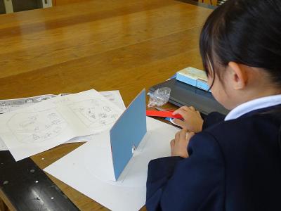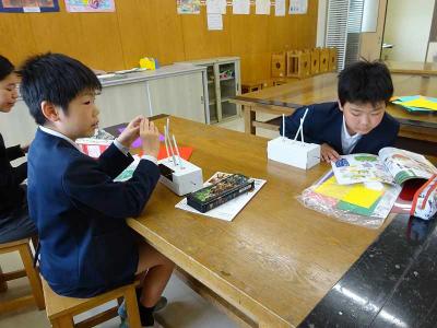 【3年国語】説明文「こまを楽しむ」の学習で、いろいろなこまに親しみました。「鳴りごま」や「逆さゴマ」など、珍しいこまで遊んでみました。遊び方が分からないときは、説明文を読んで確かめました。
