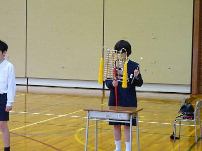 【高学年】昼休みに、「倶利伽羅峠の歌」の楽器の練習をしています。音楽会での全校発表の要となる太鼓や鉄琴の練習をしています。6年生のリーダーが中心となって練習を進めています。去年の演奏の動画を参考にして、練習しています。