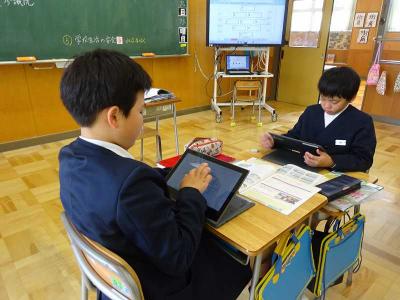 【5・6年道徳】節度について考え、「ながら行動」について話し合いました。即座にお互いの考えを端末で見合うことで、活発に議論し合いました。
