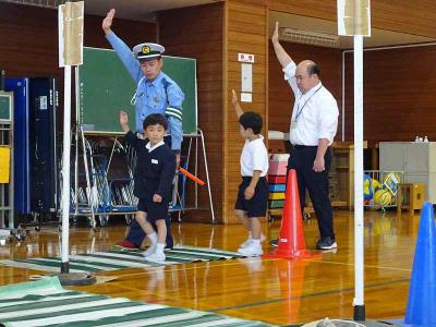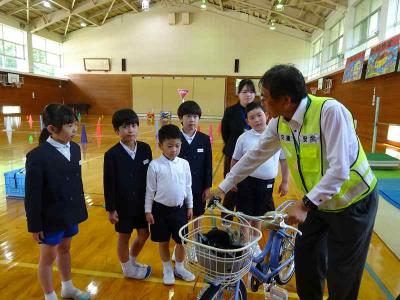 【交通安全教室】1年生は、横断歩道の歩き方を教えていただきました。左右をしっかりと確認して横断することができました。3年生は、自転車の乗り方を教えていただきました。横断歩道は、自転車を降りて安全に横断することができました。