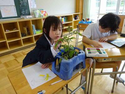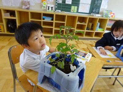 【2年国語】「観察名人になろう」をテーマに、ミニトマトを観察して、絵と文で表しました。
