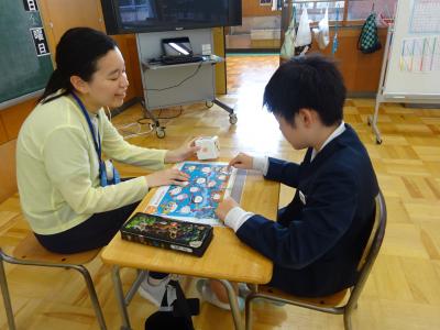 【1年生】自己紹介カードを書いて、校内の先生方と名刺交換しました。好きなものも上手に伝えることができました。
