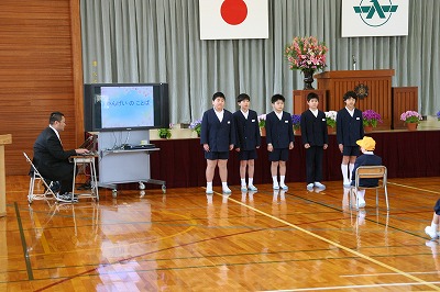 4月19日に防犯教室を行いました。不審者に遭遇したときの避難の仕方について,児童の役割演技と津幡警察署の方のお話で学習しました。「いか・の・お・す・し」の合い言葉で確認しました。また、危ない場所の合い言葉「ひまわり」も習いました。