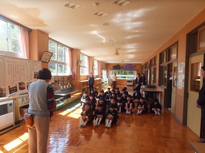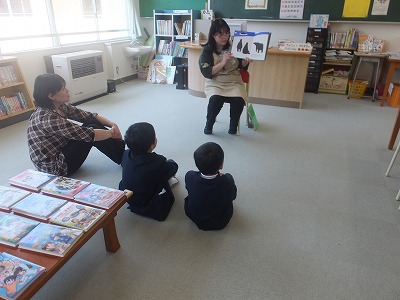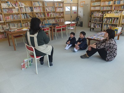 今朝、一年生は学校図書館司書の中田先生に読み聞かせをしてもらいました。