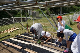 ひょうたん名人の小谷先生に教えてもらって、4種類のひょうたんを植えました。たくさんのひょうたんがなるといいですね。
