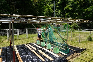 ネットをつけて、つるが上に伸びていくようにしています。