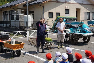 刈安小学校の児童27人と寺尾保育園の4歳児・5歳児は、営農組合の方から苗の植え方を教えていただき、はだしで田んぼに入り、「かぐらもち」の苗を植えました。