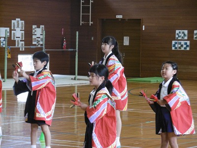 今日の児童集会では刈安ソーランを1年生や保育園の年長さんたちに