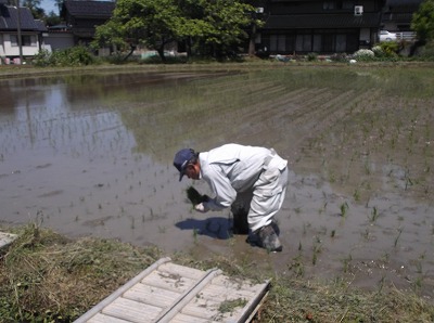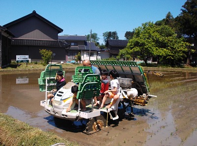 半分ほど手で植えた後、残りの半分は田植え機に乗せていただき、田植え体験です。