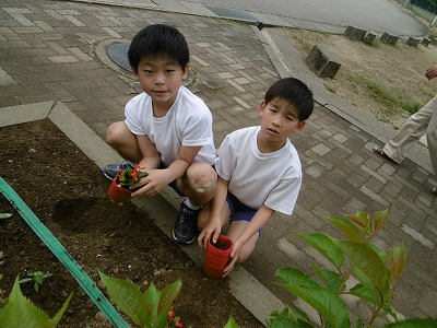 子どもたちは慣れた様子で手際よく苗を植えていました。