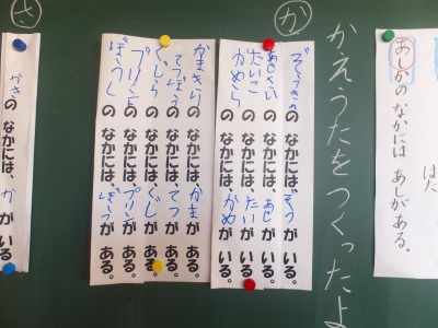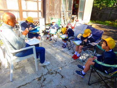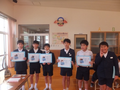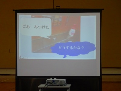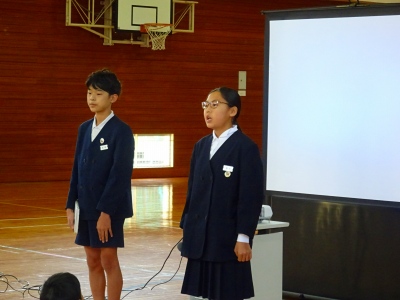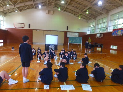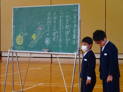 10月のふりかえりでは、スライドを見ながら、資源回収、窓ふき、ひょうたん先生、しだれ桃植樹などから地域の方、おうちの方への感謝の気持ちをもちました。
