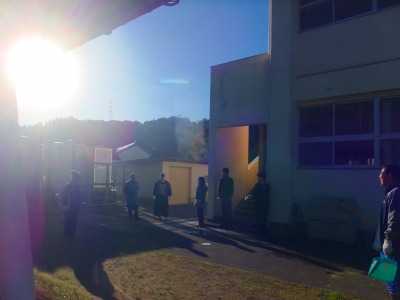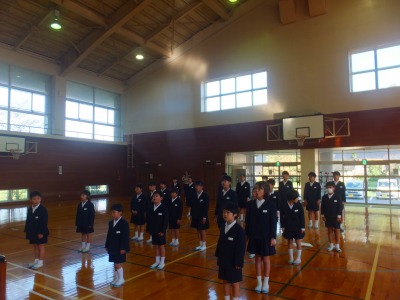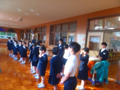 学校の玄関での解散式。もう一度、めあてにたち戻り、ふりかえりです。