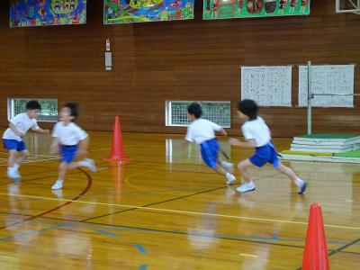 【1・2年体育】しっぽ取りをして、元気いっぱいに走りました。