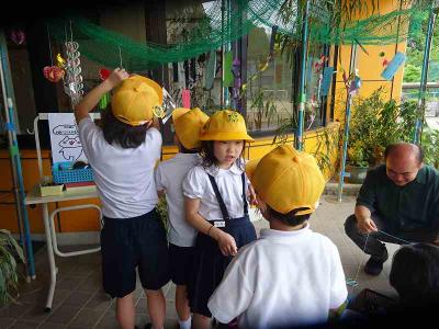 【1・2年図工】七夕飾りを作りました。色紙で天の川を作ったり、短冊に願い事を書いたりしました。公民館さんの笹に飾り付けさせていただきました。