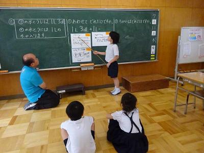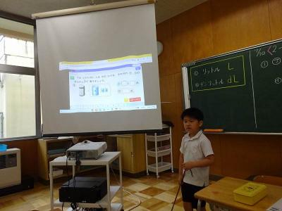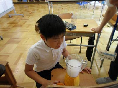 【2年算数】水のかさについて、実際に水の量を測りながら学習しました。