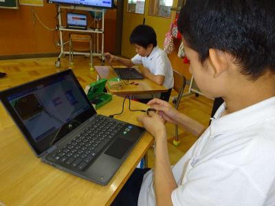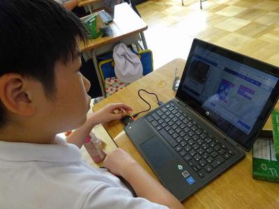 【5・6年】プログラミング学習で、マイクロビットの学習をしました。プログラミングにより、明かりをつけたり音を出したりしました。