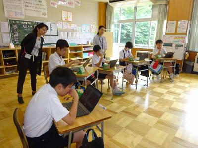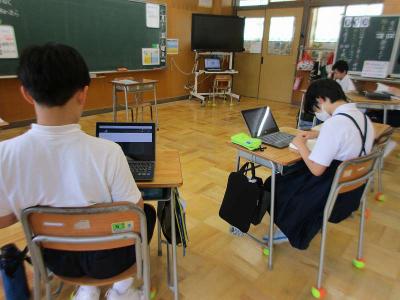 【3年】オンラインミーティングをしました。学校のあちこちでお互いに離れた場所でミーティングを行いました。