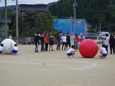 運動会も終盤。ご来賓・PTAの皆様による「転がせ大玉」レースです。